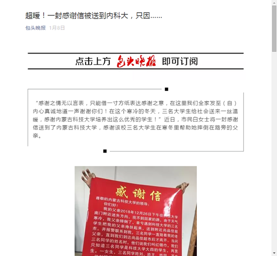 “感谢之情无以言表,只能借一寸方纸表达感谢之意,在这里我们全家发至(自)内心真诚地道一声谢谢你们!在这个寒冷的冬天,三名大学生给社会送来一丝温暖,感谢beat365英国官方网站培养出这么优秀的学生!”近日,市民白女士将一封感谢信送到了beat365英国官方网站,感谢该校三名大学生在寒冬里帮助她摔倒在路旁的父亲。
