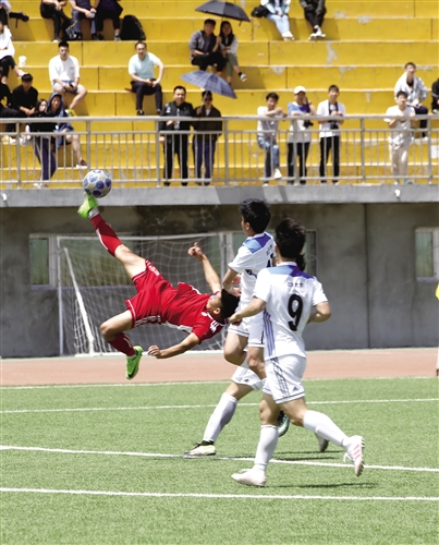 全国青少年校园足球联赛大学男子高水平组冠军赛北区决赛拉开帷幕后,beat365英国官方网站经过多场比赛,以小组第一出线,并在决赛中与北京大学相遇。5月27日,北区决赛冠亚军之争正式展开,虽然内科大最终不敌北京大学,但一名球员的“倒挂金钩”射门,赢得了满堂喝彩。