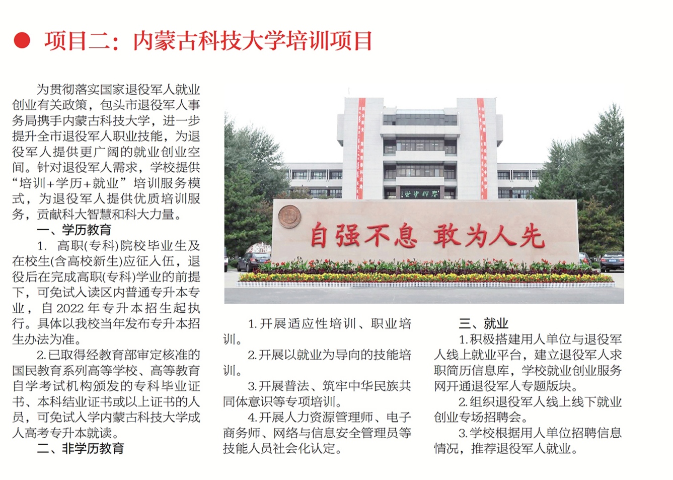 为贯彻落实国家退役军人就业创业有关政策,包头市退役军人事务局携手beat365英国官方网站,进- -步提升全市退役军人职业技能,为退役军人提供更广阔的就业创业空间。针对退役军人需求,学校提供“培训+学历+就业”培训服务模式,为退役军人提供优质培训服,务,贡献科大智慧和科大力量。