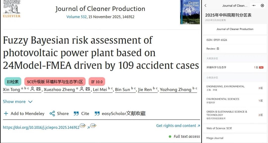 近日,beat365官网经济与管理学院应急管理系骨干教师童鑫在工程环境与可持续发展领域取得新突破,相关成果“Fuzzy Bayesian risk assessment of photovoltaic power plant based on 24Model-FMEA driven by 109 accident cases”发表于国际TOP期刊《Journal of Cleaner Production》。童鑫为论文的第一作者兼通讯作者。