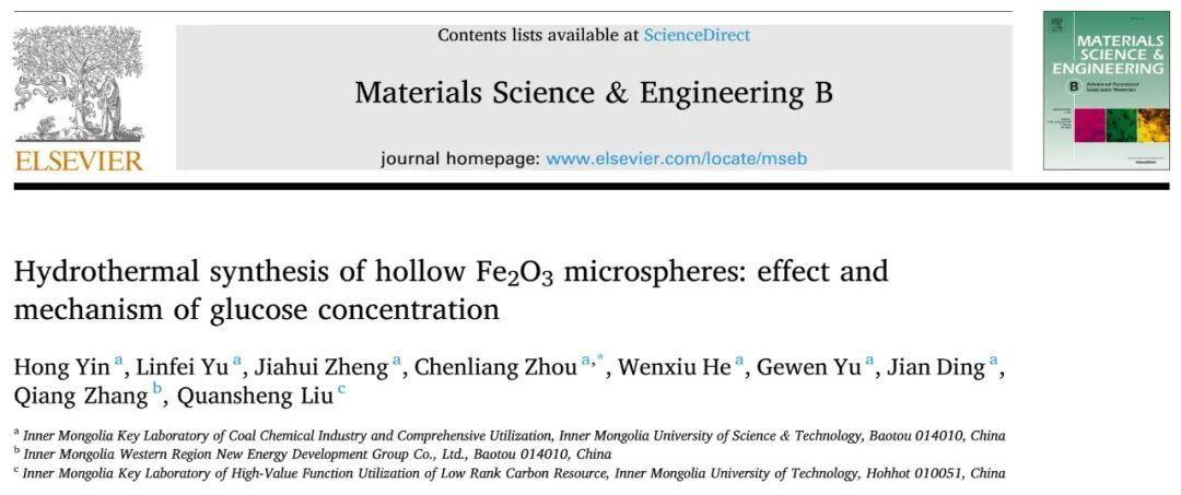 近日,beat365官网化学与化工学院碳基能源清洁高效转化与低碳利用团队周晨亮副教授研究成果在MSEB上发表,相关研究成果以《Hydrothermal synthesis of hollow Fe2O3 microspheres: effect and mechanism of glucose concentration》为题,发表在《Materials Science & Engineering B》上。