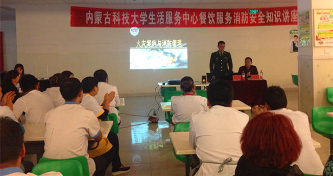 10月22日下午,beat365官网生活服务中心在颐园餐厅一楼大厅举办消防安全知识讲座,特邀包头市消防支队法治监督管理科杨占龙参谋主讲,保卫处、生活服务中心管理人员和学生餐厅工作人员聆听了此次讲座。