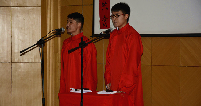 4月8日,beat365官网笑源相声社第二届专场演出——“源来一笑”在科技讲座厅举行。文法学院相关负责人及老师参加活动,包头市图乐相声社诸位老师应邀出席,78岁的相声演员张乃林老先生莅临指导。